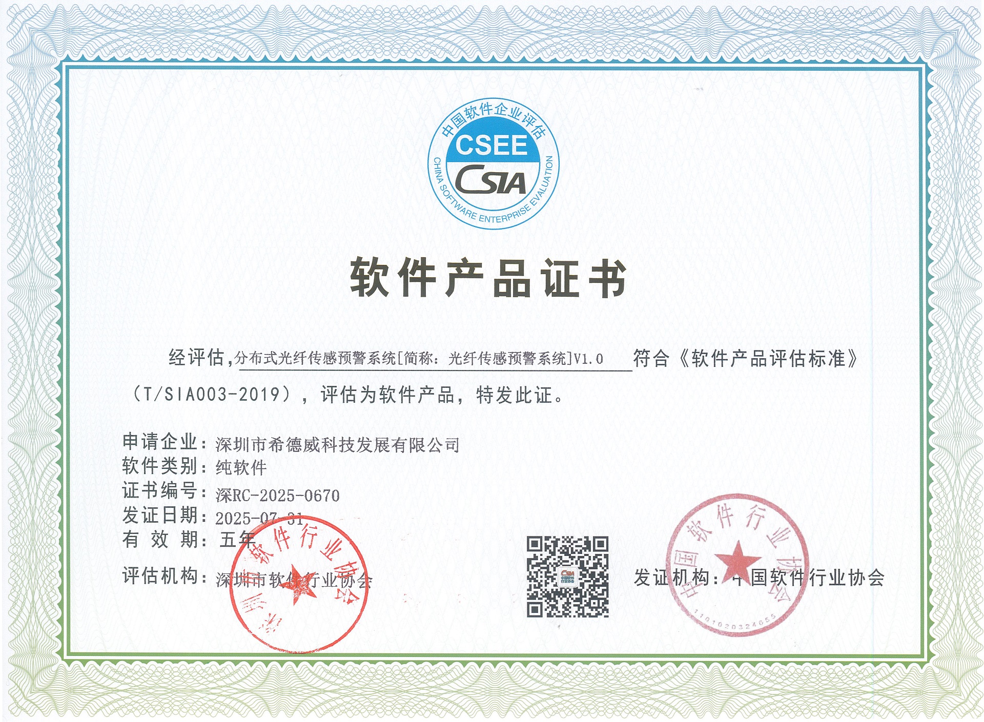恭喜我司分布式光纤传感预警系统荣获软件产品证书!