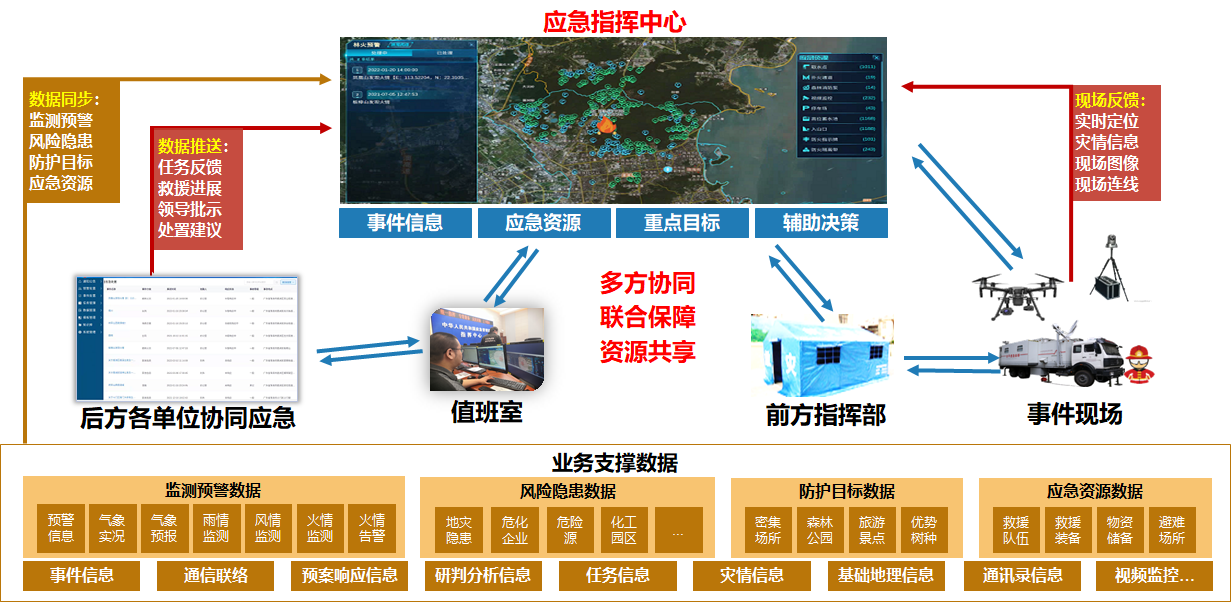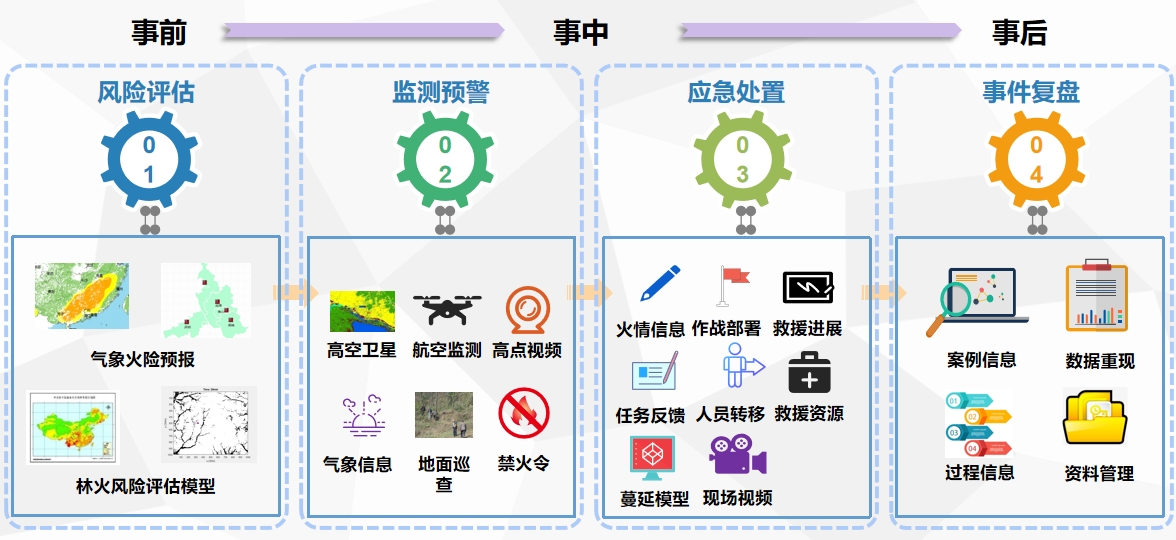 后台管理系统是面向森防管理人员和林火处置相关责任部门工作人员,通过后台管理端实现综合信息管理和业务流程处理,日常工作中支持完成信息发布和数据更新工作;战时,可实现启动应急响应、资源管理、预警处置、信息接报、事件生成、汇聚现场灾情信息,组织力量、下发通知和任务等功能,是指挥领导与现场救援人员间信息传递的枢纽。