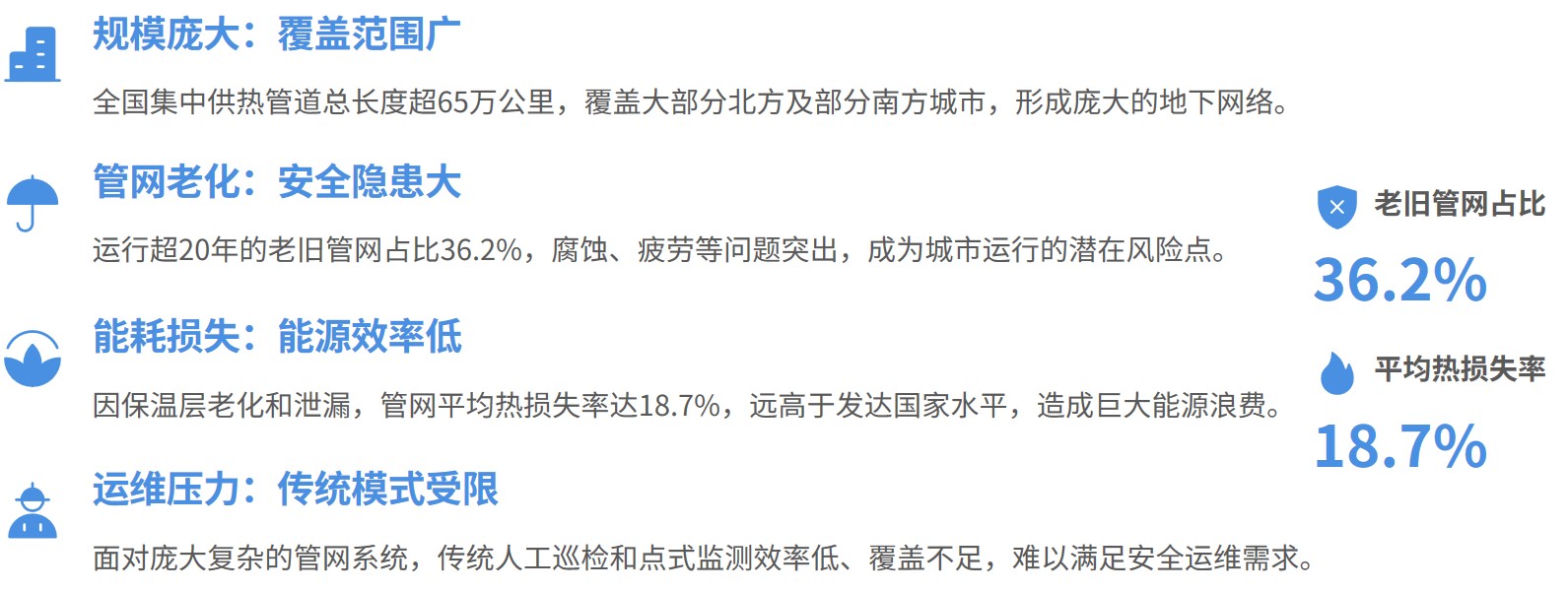 我国供热行业规模庞大,截至 2024 年底管网总长65.59 万公里,但老旧管网占比高、热损大、智能化水平低。行业正加速清洁化、智慧化转型,同时面临成本价格倒挂、改造资金不足、计量推广缓慢等痛点,亟需技术升级与精细化运维。