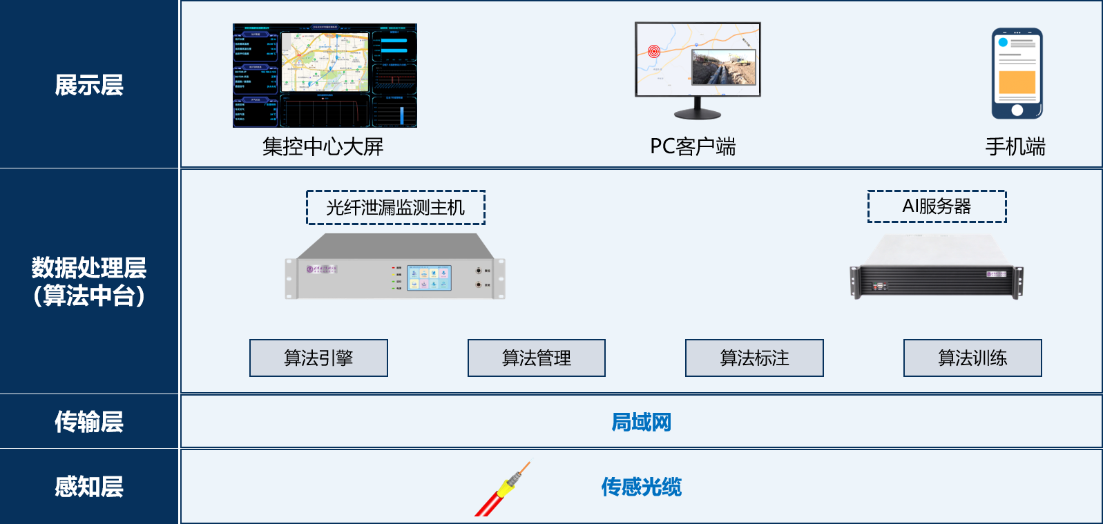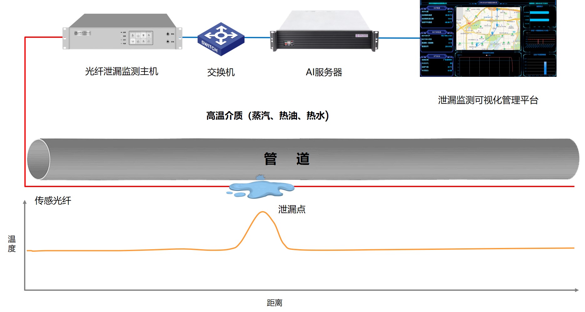 希德威光纤测漏监测系统由传感光缆、光纤泄漏监测主机、AI服务器、专用感知算法及泄漏监测可视化管理平台组成,各组件协同联动、高效适配。系统依托先进的智能分析算法,精准聚焦高温介质管道泄漏风险防控痛点及隐患监控薄弱环节,构建全方位、全流程的管道泄漏监测体系,形成“事前预警、事中处置、事后复盘”的完整风险事件管理闭环,有效防范高温液体泄漏引发的各类安全事故,实现管道安全受控、稳定运行。
