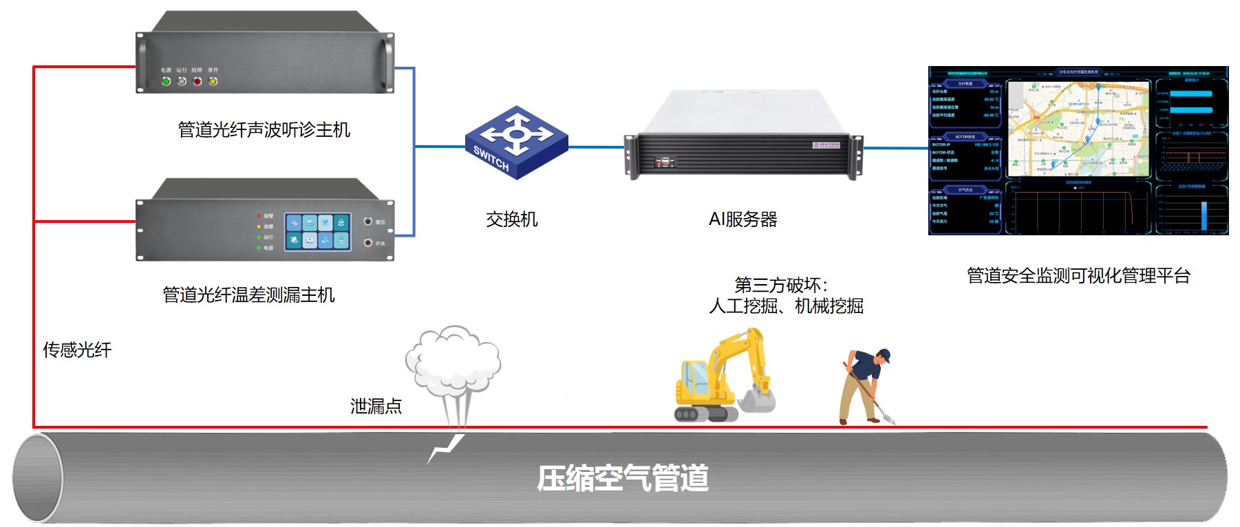 分布式光纤传感技术为压缩空气管道安全监测提供了高效、可靠的全新解决方案。该技术以沿管道敷设的光纤作为传感器,利用分布式声波传感与分布式测温融合,实时感知管道沿线振动、声波及温度变化。压缩空气高压泄漏时会产生典型高频振动信号,并伴随焦耳‑汤姆逊效应引发局部温降,系统可精准识别泄漏特征并实现米级定位。同时可有效监测第三方施工、管体异常等安全隐患。系统无源防爆、抗电磁干扰、覆盖距离长、响应速度快,能够 24 小时不间断在线预警,大幅提升压缩空气管网运行稳定性与安全性,适用于工业厂区、矿山、长输管线等多种场景。