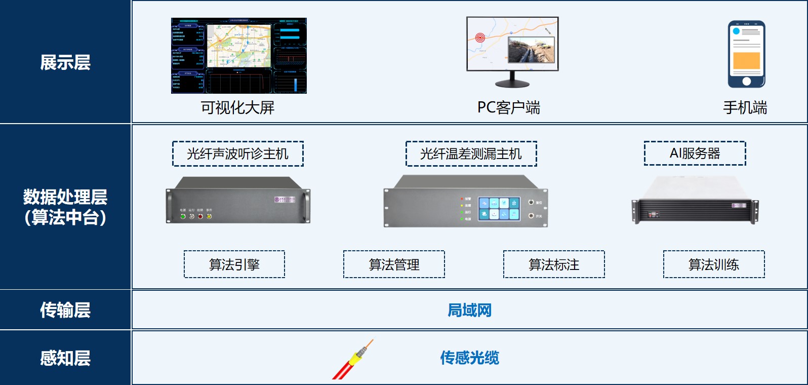 希德威压缩空气管道安全监测系统由传感光缆、光纤声波听诊主机、光纤温差测漏主机、AI服务器、专用感知算法及管道安全监测可视化管理平台组成,各组件协同联动、高效适配。系统依托先进的智能分析算法,精准聚焦压缩空气管道安全风险防控痛点及隐患监控薄弱环节,构建全方位、全流程的管道泄漏监测体系,形成“事前预警、事中处置、事后复盘”的完整风险事件管理闭环,有效防范压缩空气管道引发的各类安全事故,实现管道安全受控、稳定运行。